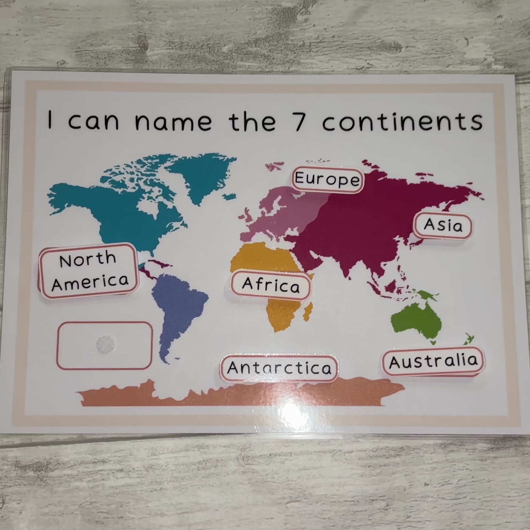 Support your child learn the 7 continents of the world with this velcro activity mat. Children can learn the names Europe, Africa, Asia, Australia, Antarctica, North America and South America then match them on the mat. This supports children's Understanding of the World learning and Geography knowledge.